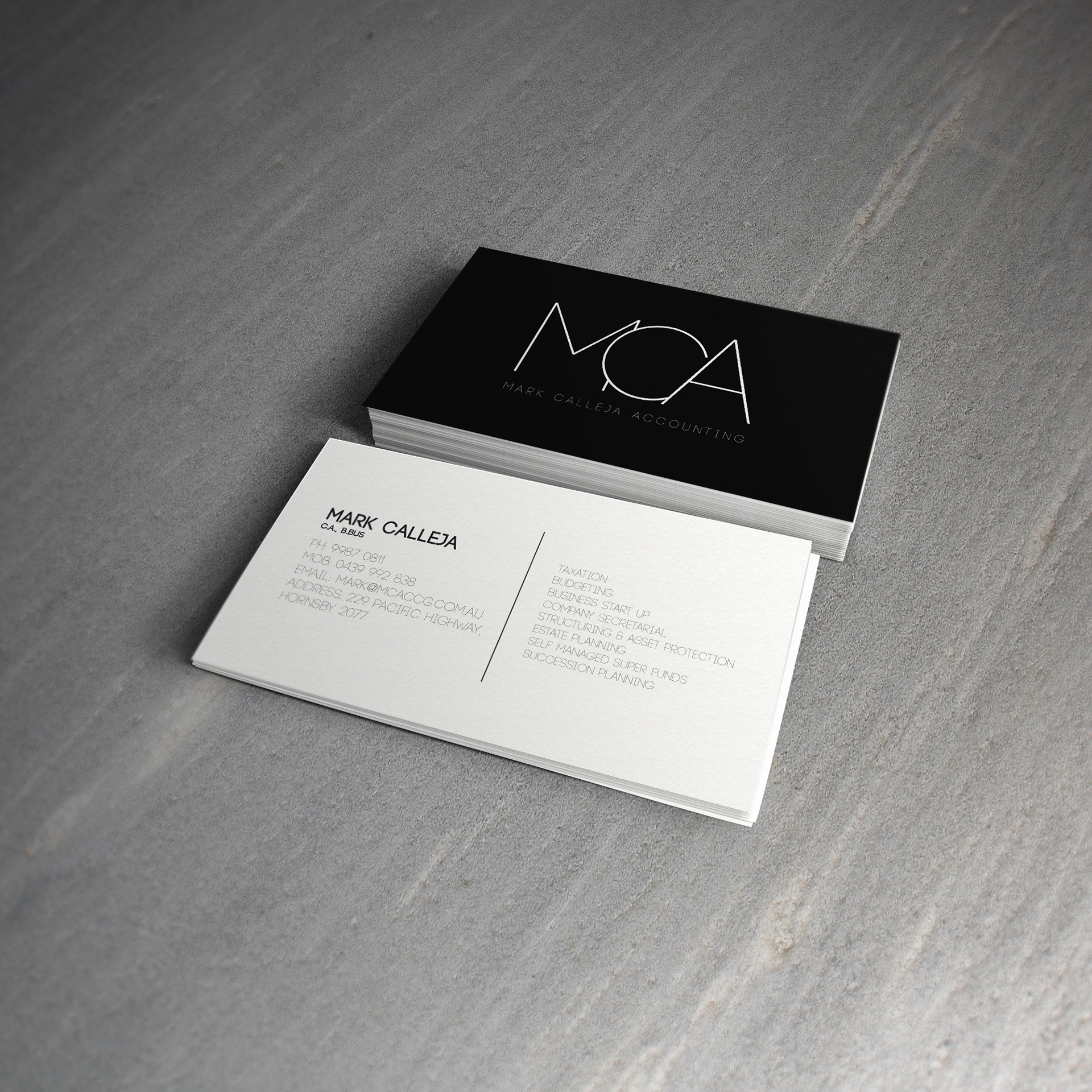 I was approached to redesign the logo for Mark Calleja Accounting. This project was to create a corporate identity that was to be clean and simple.